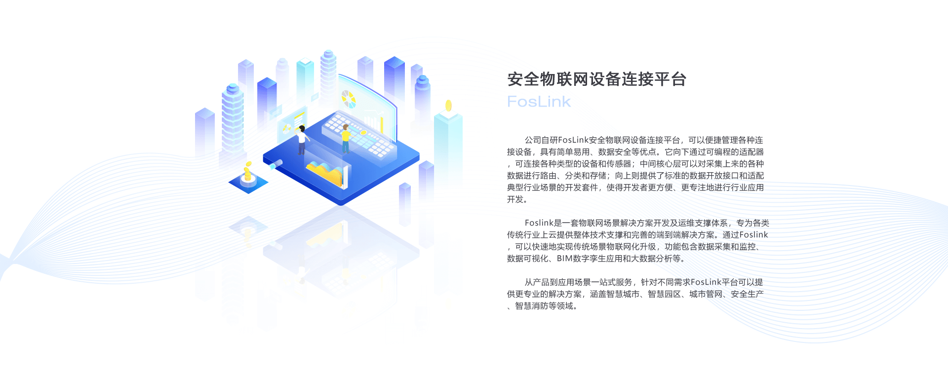 從產(chǎn)品到應(yīng)用場(chǎng)景一站式服務(wù),針對(duì)不同需求FosLink平臺(tái)可以提供更專業(yè)的解決方案,涵蓋智慧城市、智慧園區(qū)、城市管網(wǎng)、安全生產(chǎn)、智慧消防等領(lǐng)域。